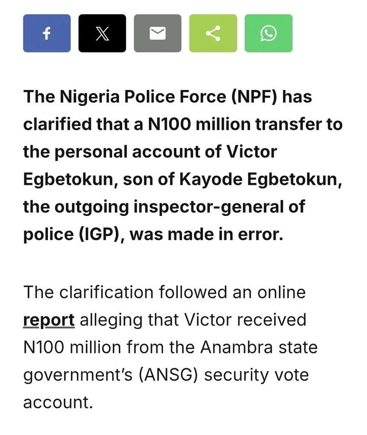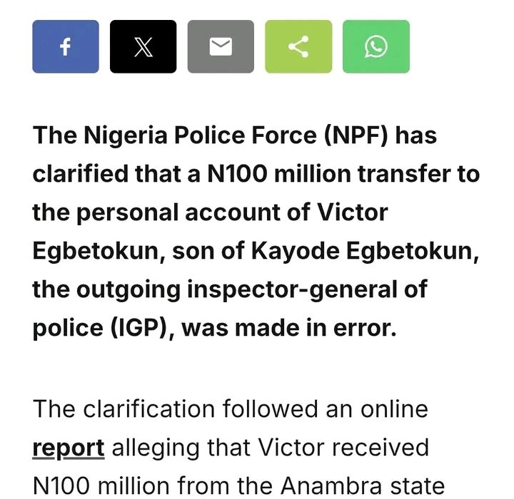 The Nigeria Police Force (NPF) has issued an official clarification stating that a ₦100 million bank transfer to the personal account of Victor Egbetokun, son of the outgoing Inspector-General of Police, Kayode Egbetokun, was an accidental error and not a deliberate payment.